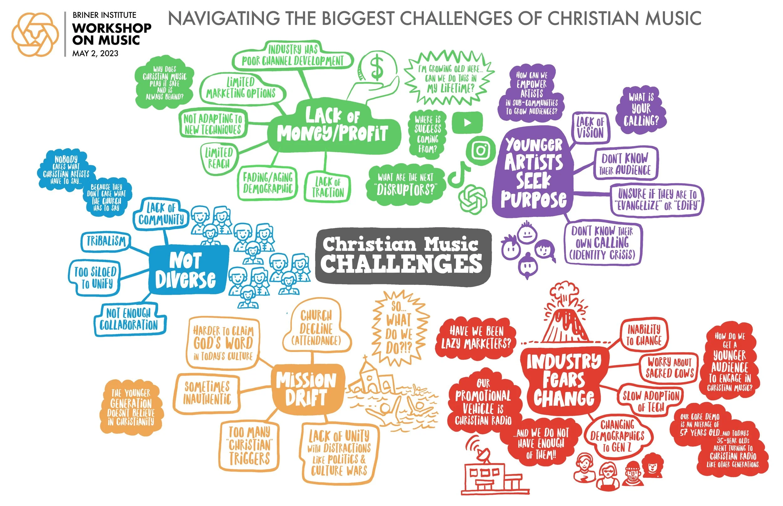 To answer these and other questions, The Briner Institute’s executive director Barry Landis has been hosting a series of meetings with several Christian music insiders for several years now. Motivated by the message of Roaring Lambs in addition to his relationships across the genre, the group has zeroed in on several problems or challenges the music format faces. Meeting recently in Nashville, TN Landis and The Briner Institute conducted a Design Workshop which gathered the participants to compare notes on their answers to the question: What are the biggest problems facing our industry?